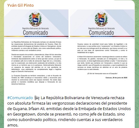 «Venezuela rechaza con absoluta firmeza las vergonzosas declaraciones del presidente de Guyana, Irfaan Ali, emitidas desde la Embajada de Estados Unidos en Georgetown, donde se presentó, no como jefe de Estado, sino como subordinado político, rindiendo cuentas a sus verdaderos amos», indicó el canciller del régimen, Yván Gil, en un comunicado.